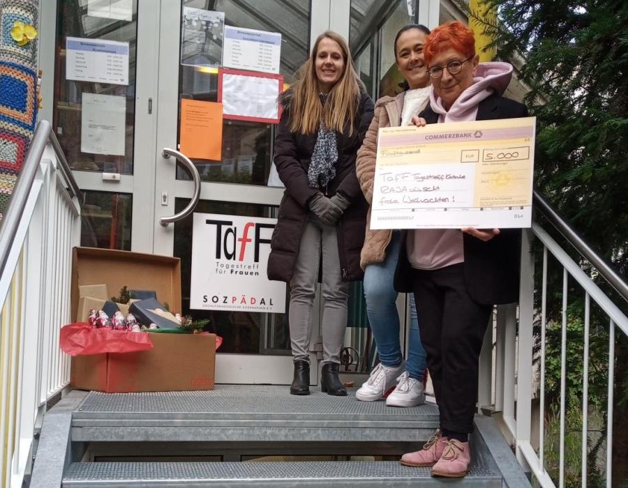 Die Firma Rajapack spendete zum wiederholten Male eine große Summe zur Unterstützung der Arbeit im Tagestreff. Zusätzlich haben die Kolleginnen und Kollegen ihre Kleiderschränke geräumt und unsere Kleiderkammer mit hochwertigen Kleidungsstücken gefüllt. Wir freuen uns sehr, vor allem über das große Interesse an unserer Arbeit und die positive Haltung zu Frauen in Armut und Wohnungslosigkeit. Bei dieser Übergabe haben wir auch erfahren, dass die Geschäftsführerin in Frankreich ein großes Herz vor allem für Frauen in besonders schwierigen Lebenslagen hat und alle ihre Mitarbeitenden diesen Geist leben.