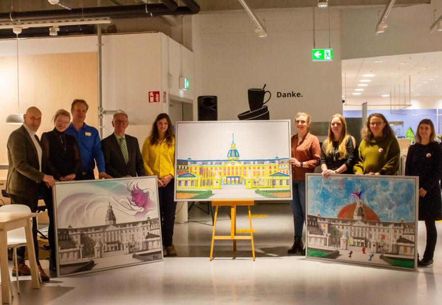 Durch eine ebenfalls von IKEA organisierte Versteigerung von Kunstwerken wurde zusätzlich die Arbeit von SOZPÄDAL unterstützt. – Herzlichen Dank, IKEA! Das Foto von Juliana Römer/ IKEA Karlsruhe zeigt die Bilder, die zur Versteigerung standen mit den Personen, die diese ersteigert haben.